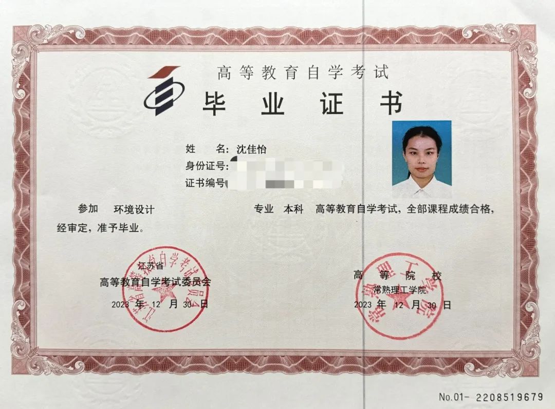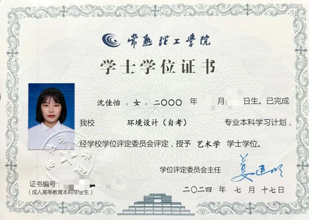 为拓宽职业道路并提升个人综合能力,沈佳怡毅然决然报名参加了学校和常熟理工学院合作的特色自考。她利用业余时间系统学习环境设计专业的各项课程,经过不懈的努力和辛勤的付出,终于在2024年7月成功获得了常熟理工学院环境设计专业的本科毕业证书和学位证书。